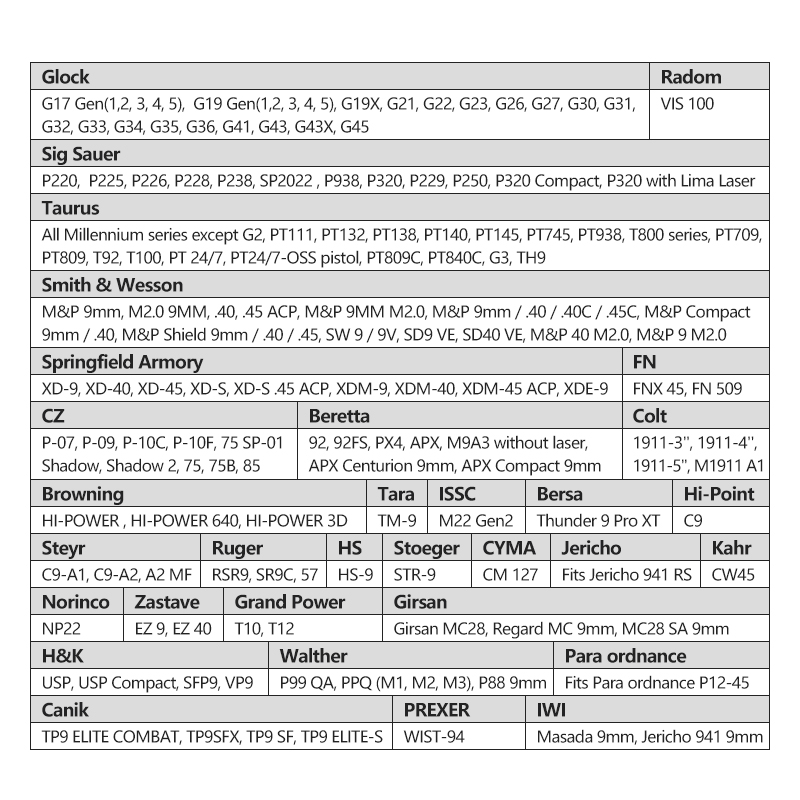 This Mega-Fit Light is widely compatible with 150+ popular full size or compact semi-automatic pistols with Streamlight TLR-1 or TLR-2, such as Glock, Beretta, Browning, etc. It also fits handguns with interchangeable red dot sight and high front sight.